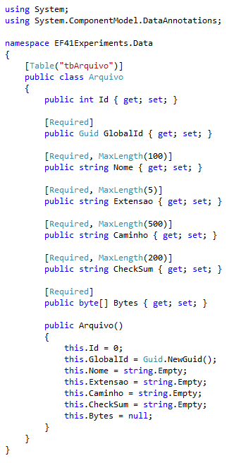 No Entity Framework 4.1 o armazenamento de dados binários no banco de dados é mais simples. Antes, no LINQ to SQL, era preciso criar uma instância da classe System.Data.Linq.Binary, valorizá-la com os dados binários e atribuí-la a sua propriedade correspondente em nossa entidade. Agora este cenário é mais simples, pois para persistir dados binários é apenas preciso criar uma propriedade do tipo byte[] (byte array) e lhe atribuir os dados diretamente.