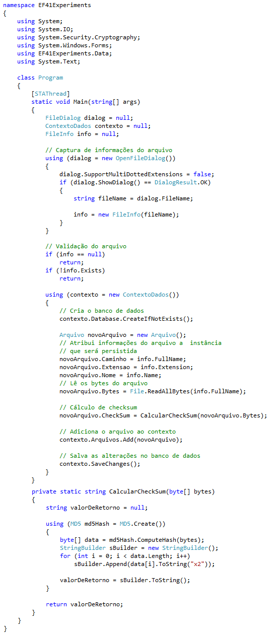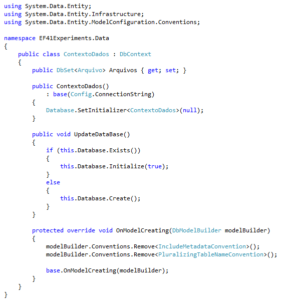 Aqui estão os códigos da classe Arquivo (a entidade que será persistida no banco de dados), a classe ContextoDados (classe que herda de DbContext e faz o papel de proxy para nossas requisições com o banco de dados), e a classe Config (que é responsável por acessar configurações de nossa aplicação, como por exemplo a string de conexão).