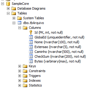 Detalhe importante, para a coluna que irá conter os dados binários, o Entity Framework 4.1 criou na tabela uma coluna do tipo varbinary(max).