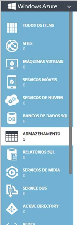 Antes de começarmos a trabalhar com o Windows Azure storage é preciso criar um Windows Azure Storage account. Abra seu portal do Windows Azure e clique na opção “Armazenamento”, localizada no menu lateral.