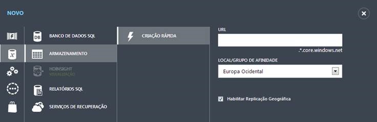 Clique em “+Novo” para criar um novo Windows Azure storage account. Podemos utilizar a opção de criação rápida, informando apenas a URL e a localização geográfica dos nossos dados.