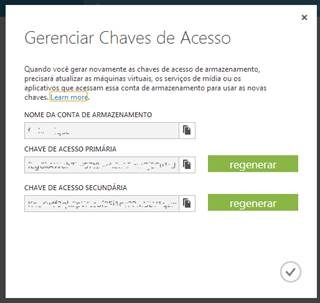 Para acessar as chaves de acesso basta abrir o portal do Windows Azure, acessar a Seção de Armazenamento e clicar em “Gerenciar Chaves de Acesso”. Nesta janela estarão as chaves de acesso primária e secundária.