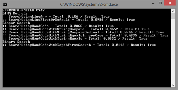 static bool SearchUsingHandCodeWithStringCompare(IList<EstruturaHierarquica> targetList, string searchParameter) { foreach (var item in targetList) { if (string.Compare(item.CodigoTipoRegistro, searchParameter) == 0) return true; } return false; } static bool SearchUsingHandCodeWithStringEquals(IList<EstruturaHierarquica> targetList, string searchParameter) { foreach (var item in targetList) { if (string.Equals(item.CodigoTipoRegistro, searchParameter)) return true; } return false; } static bool SearchUsingHandCodeWithStringEqualsCurrentCultureIgnoreCase(IList<EstruturaHierarquica> targetList, string searchParameter) { foreach (var item in targetList) { if (string.Equals(item.CodigoTipoRegistro, searchParameter, StringComparison.CurrentCultureIgnoreCase)) return true; } return false; } static bool SearchUsingHandCodeWithStringCompareOrdinal(IList<EstruturaHierarquica> targetList, string searchParameter) { foreach (var item in targetList) { if (string.CompareOrdinal(item.CodigoTipoRegistro, searchParameter) == 0) return true; } return false; } static bool SearchUsingHandCode(IList<EstruturaHierarquica> targetList, string searchParameter) { foreach (var item in targetList) { if (item.CodigoTipoRegistro == searchParameter) return true; } return false; } static void PopulateList(IList<EstruturaHierarquica> targetList) { for (int i = 0; i < POPULATIONSIZE; i++) { EstruturaHierarquica newNode = new EstruturaHierarquica(); newNode.CodigoTipoRegistro = string.Format(i.ToString().PadLeft(POPULATIONSIZE.ToString().Length, '0')); targetList.Add(newNode); } }