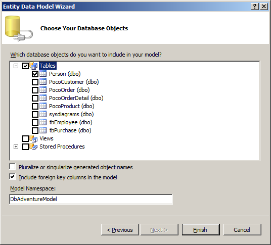 4 – Selecione o projeto Data e adicione um novo item utilizando o template ADO.Net Entity Data Model. No exemplo, criei com o nome dbModel.edmx. Este item é aquele comumente utilizado para adições de mapeamentos objeto-relacionais através do Entity Framework. Nas telas seguintes devem ser definidas: a conexão com o banco de dados e as tabelas que serão mapeadas. Neste exemplo apenas mapeei a tabela Person.