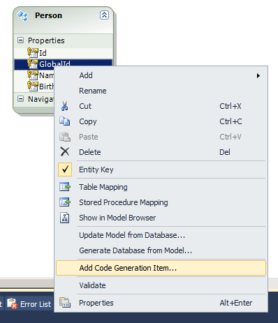 6 – Após o download dos templates, volte a ferramenta de mapeamento, clique com o botão direito sobre uma das entidades mapeadas e seleciona a opção “Add Code Generation Item”.
