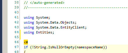 Dentro de “ModelPoco.Context.tt”, vá até a linha 44, adicione uma referência para Entities, para que a geração de estruturas POCO possa identificar os tipos de dados utilizados no contexto.