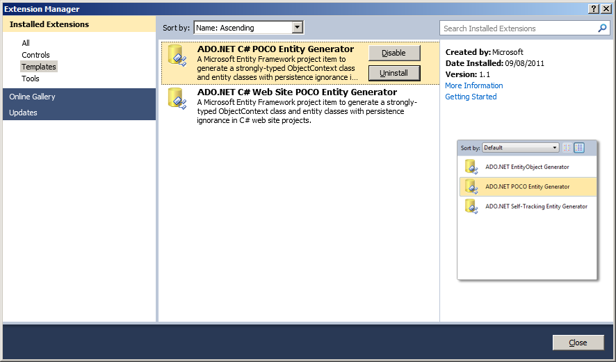 5 – Após fazer o mapeamento utilizando o Entity Framework, será preciso instalar o template ADO.Net POCO Entity Generator (caso o mesmo não esteja instalado). Clique em “Tools/Extension Manager”, selecione a aba Online Gallery e na caixa de pesquisa (localiza no canto superior direito) e pesquise por “T4”. Após a exibição dos resultados, instale os templates: “ADO.Net C# POCO Entity Generator” e “ADO.Net C# Web Site POCO Entity Generator” (caso a sua linguagem preferida seja VB.Net, então instale os templates próprios para a mesma, eles também estão disponíveis no resultado da consulta feita anteriormente).
