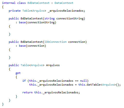 No caso, costumo criar uma classe que herde de um DataContext, e que para cada tabela, crie-se um atributo do tipo Table<E> que referencie uma entidade mapeada para a aplicação. Na imagem abaixo demonstro como faço essa implementação.