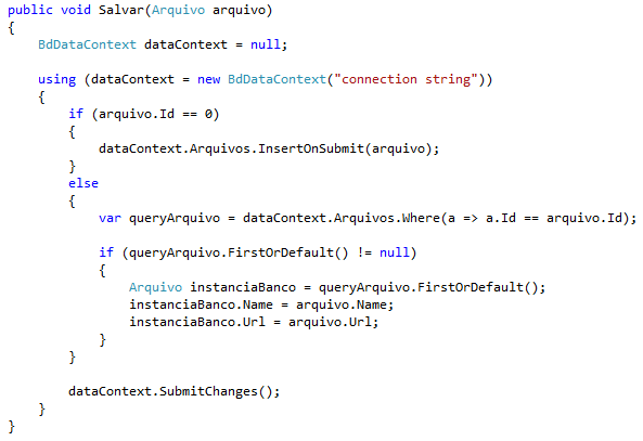 Observe que caso o valor de nossa propriedade Id seja distinto de ZERO, teremos de executar uma consulta na base de dados para retornar a instância que desejamos e assim fazermos o “de/para” dos dados de nossa instância (com valores atualizados) para a instância vinda do banco de dados.