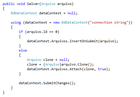 O modo mais fácil de atualizarmos dados de nosso modelo no banco de dados é através do método Attach. Assim como utilizamos o InsertOnSumit para executarmos inclusões na base de dados, o método Attach pode ser bastante útil para atualizações de nossas entidades em nossas bases de dados.